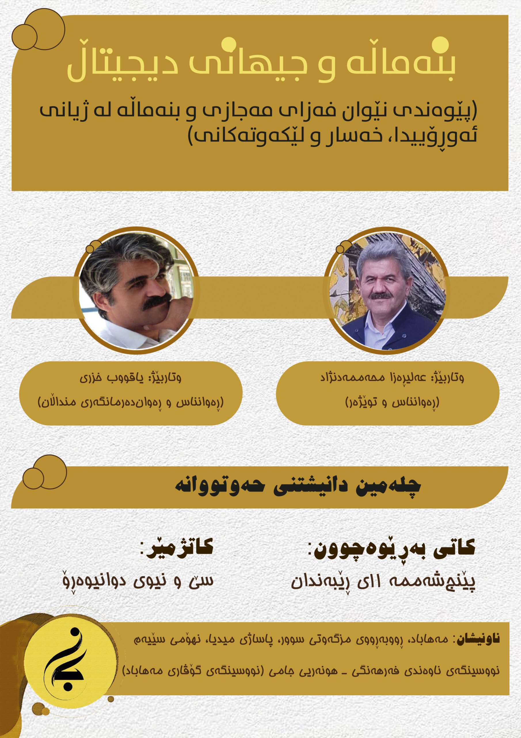 ✓ چلەمین دانیشتنی حەوتووانەی ناوەندی فەرهەنگی هونەریی جامی بە بەشداری هۆگرانی زانست و فەرهەنگی کوردی، ڕۆژی پێنجشەممە ١١ی ڕێبەندانی ١٤٠٣ی هەتاوی بە شێوەی میزگێرد، لە نووسینگەی ناوەندی فەرهەنگی – هونەریی جامی بە بەشداری ژمارەیەک له نووسەرانی شاری شنۆ و هەروەها ڕەوانناسان و ڕاوێژکارانی مەهاباد، بەڕێوە چوو.