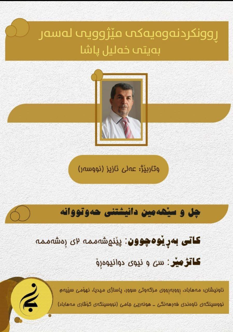 ☜ وتاری  ئەم حەوتوویە، لە ژێر سەردێڕی “ڕوون‌کردنەوەیەکی مێژوویی لەسەر بەیتی خەلیل‌پاشا” لە لایەن بەڕێز کاک عەلی ئازیز نووسەر و توێژەری هێژا پێش‌کێش کرا. لەم وتارەدا بەڕێزیان سەرەتا باسێکی مێژوویی لەسەر ناوچەی موکریان کرد و بنەما میژووییەکانی ئەم ناوچەیەی خستە بەر تیشکی لێکۆڵینەوە. پاشان چۆنێتی سەرکوت کران وسەرهەڵدانەوەی میرنشینە موکرییەکانی لە چەند پاژی مێژوویی‌دا لێک دایەوە. کاک عەلی لە درێژەدا باسی له وردەکارییەکانی ناوچەی باریکان لە ڕووی بەڵگە و دێکیۆمێنتە مێژووییەکان کرد.  لە پاڕتێکی دیکەی وتارەکەیان‌دا ئاماژەی بە چۆنێتی سەرهەڵدانی خەلیل‌پاشا و دەوری خەلیل‌پاشا لە بزووتنەوە نەتەوەییەکانی کوردی لەو سەردەم‌دا هێنایە بەر باس. هەر وەها بەشێک لە بەڵگە دەست‌نووسەکانی پێوەندیدار بە خەلیل‌پاشای  بۆ بەشداربووان خوێندەوە.