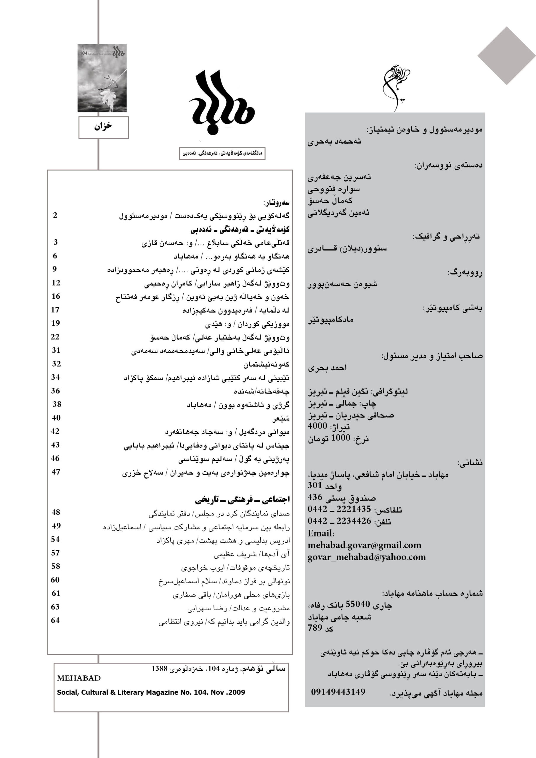 هاوڕێیانی ئازیزی گۆڤاری مەهاباد بۆ کڕینی ژومارەکانی گۆڤاری مەهاباد بە شێوازی فایلی پی دی ئێف تا کرانەویی دەرگای ئێلێکترۆنیکی کە پێویستیتان بە چ ژومارەیەک بوو تکایە پێوەندی بگرن بە تێلێفۆنەکانی بەشی پێوەندی ماڵپەڕەکەمان بە سپاسەوە هاوڕێ دەگەڵ رێزمان بۆ ئێوەی خۆشەویست.