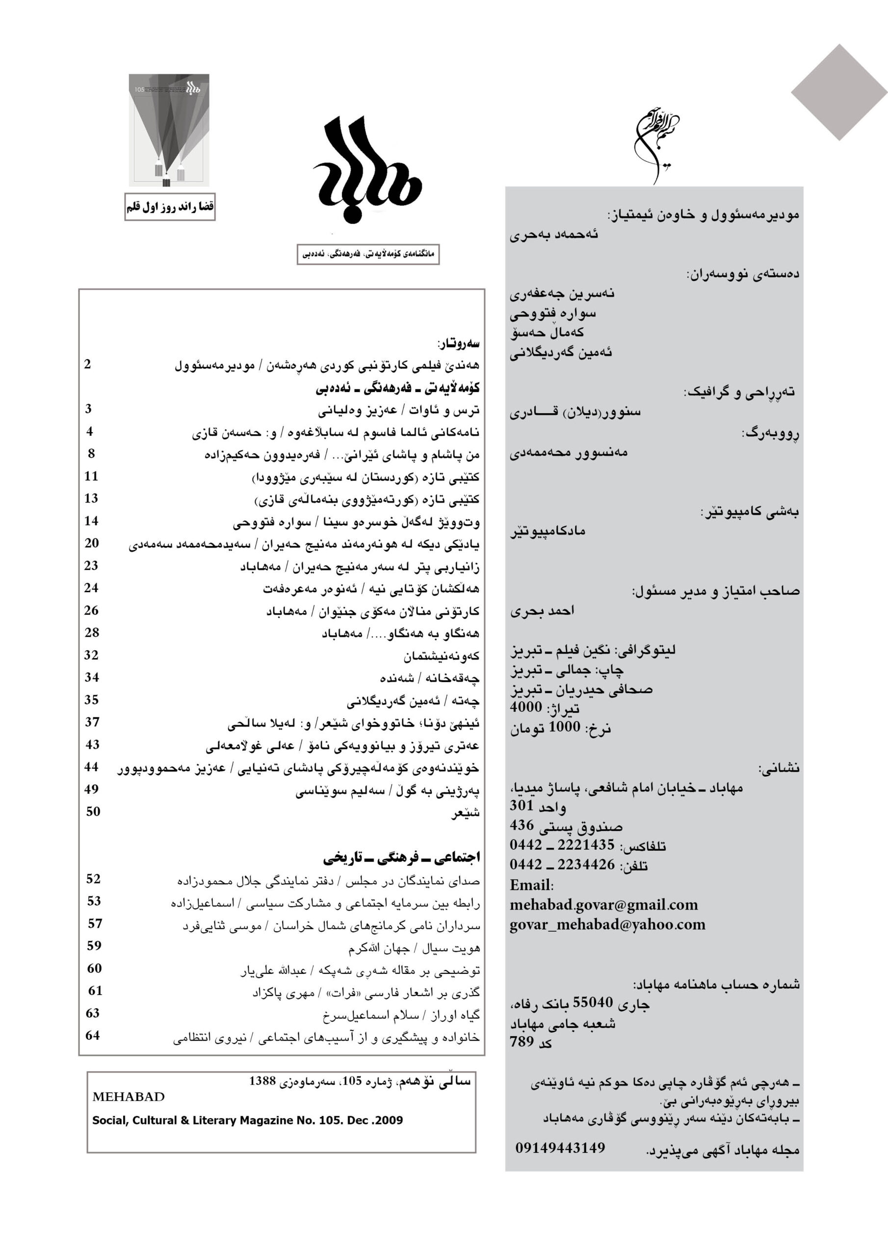 هاوڕێیانی ئازیزی گۆڤاری مەهاباد بۆ کڕینی ژومارەکانی گۆڤاری مەهاباد بە شێوازی فایلی پی دی ئێف تا کرانەویی دەرگای ئێلێکترۆنیکی کە پێویستیتان بە چ ژومارەیەک بوو تکایە پێوەندی بگرن بە تێلێفۆنەکانی بەشی پێوەندی ماڵپەڕەکەمان بە سپاسەوە هاوڕێ دەگەڵ رێزمان بۆ ئێوەی خۆشەویست.