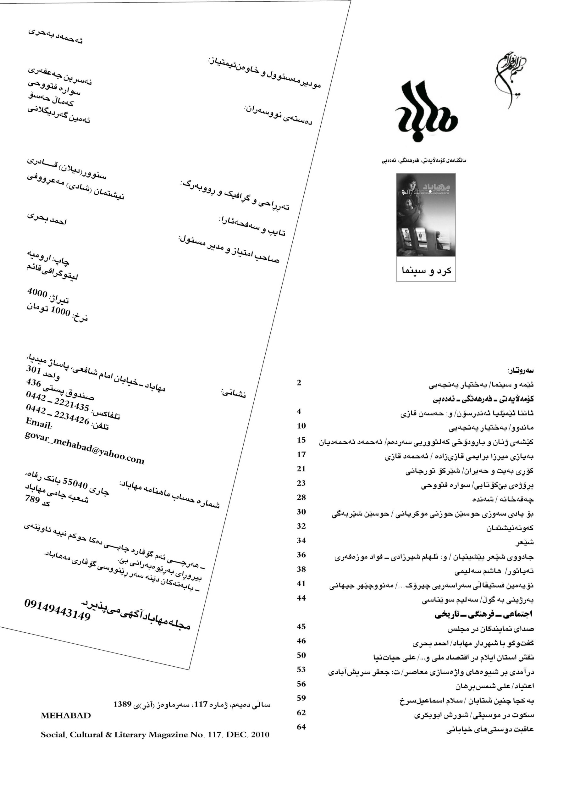 هاوڕێیانی ئازیزی گۆڤاری مەهاباد بۆ کڕینی ژومارەکانی گۆڤاری مەهاباد بە شێوازی فایلی پی دی ئێف تا کرانەویی دەرگای ئێلێکترۆنیکی کە پێویستیتان بە چ ژومارەیەک بوو تکایە پێوەندی بگرن بە تێلێفۆنەکانی بەشی پێوەندی ماڵپەڕەکەمان بە سپاسەوە هاوڕێ دەگەڵ رێزمان بۆ ئێوەی خۆشەویست.