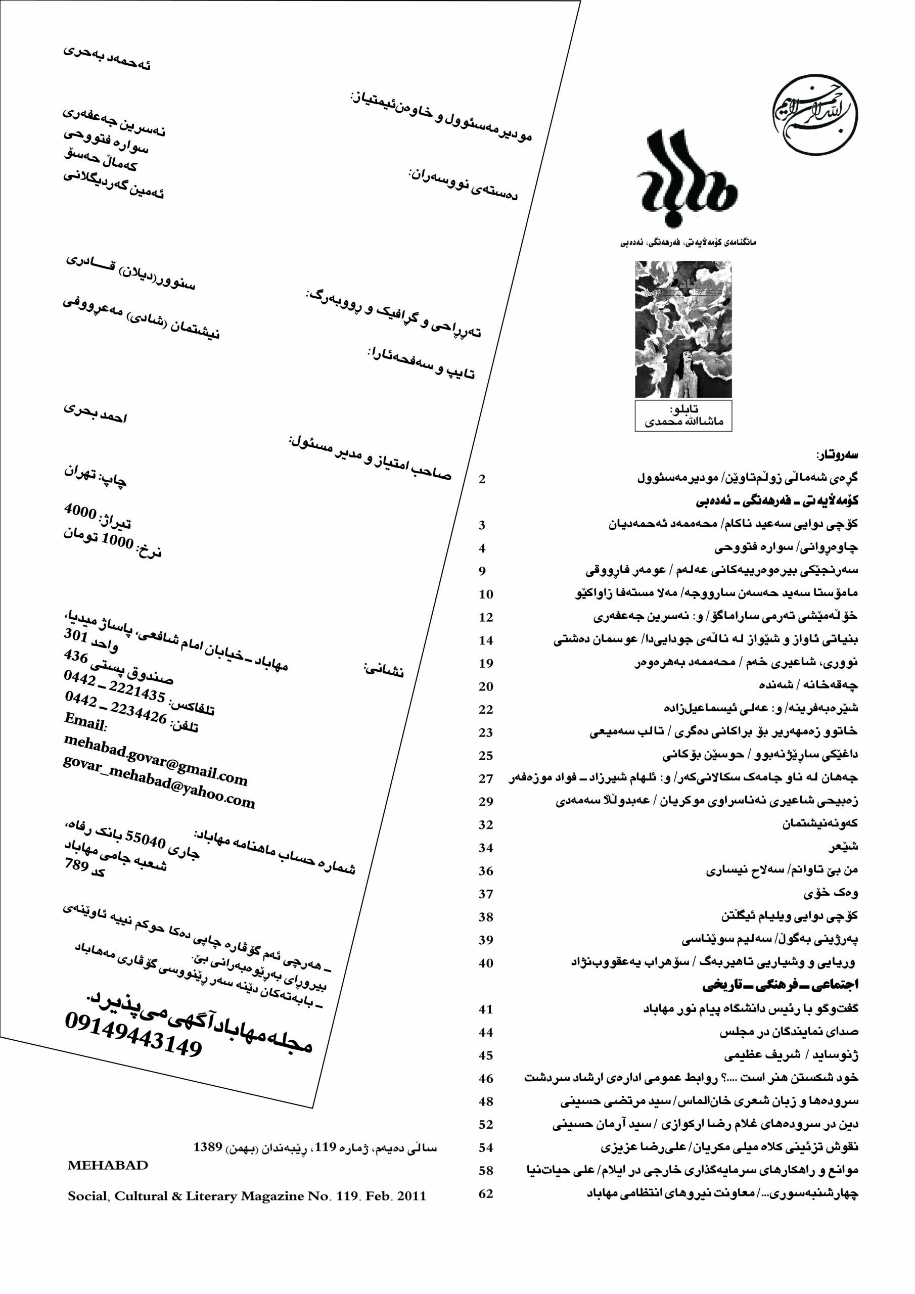 هاوڕێیانی ئازیزی گۆڤاری مەهاباد بۆ کڕینی ژومارەکانی گۆڤاری مەهاباد بە شێوازی فایلی پی دی ئێف تا کرانەویی دەرگای ئێلێکترۆنیکی کە پێویستیتان بە چ ژومارەیەک بوو تکایە پێوەندی بگرن بە تێلێفۆنەکانی بەشی پێوەندی ماڵپەڕەکەمان بە سپاسەوە هاوڕێ دەگەڵ رێزمان بۆ ئێوەی خۆشەویست.