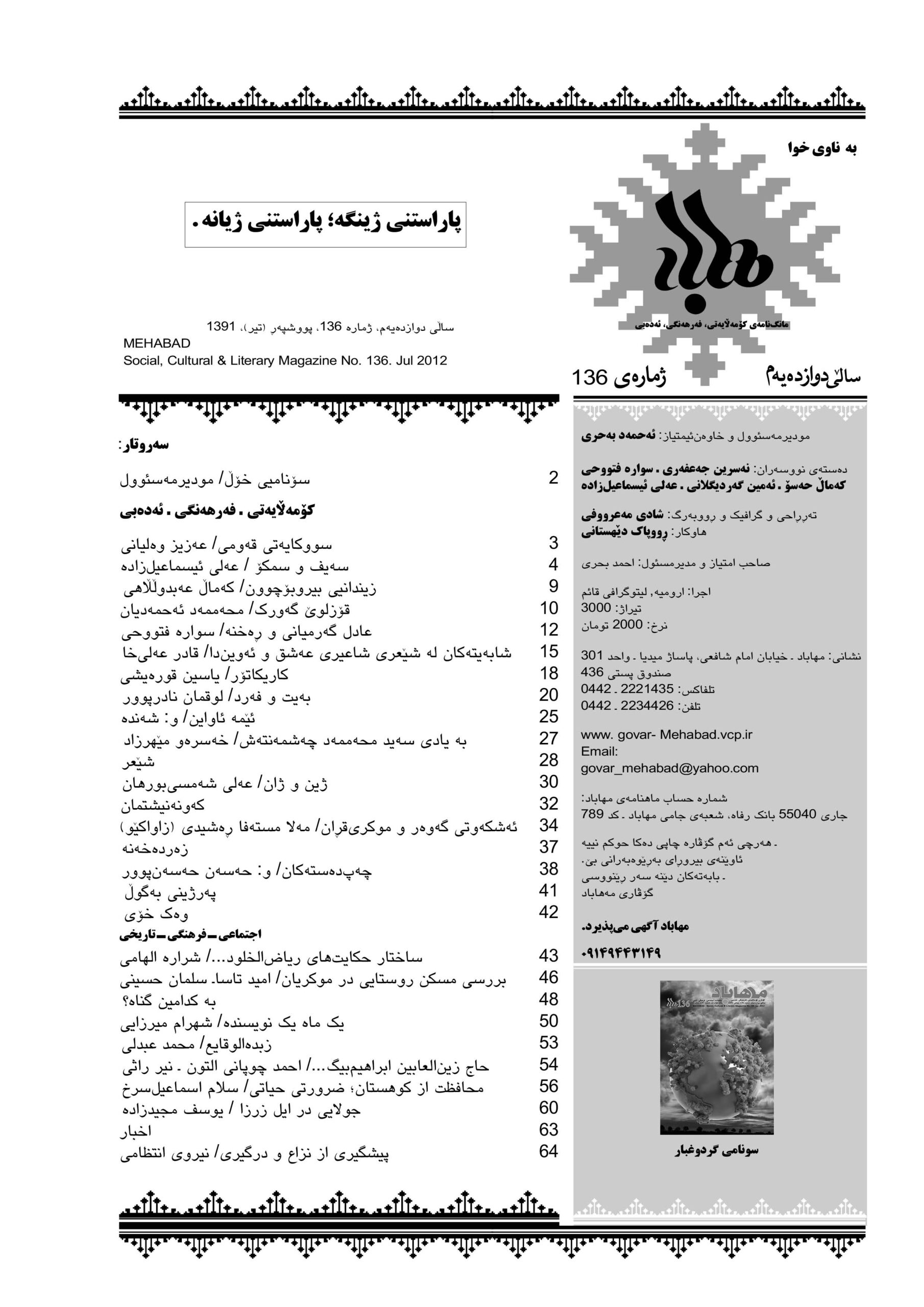 هاوڕێیانی ئازیزی گۆڤاری مەهاباد بۆ کڕینی ژومارەکانی گۆڤاری مەهاباد بە شێوازی فایلی پی دی ئێف تا کرانەویی دەرگای ئێلێکترۆنیکی کە پێویستیتان بە چ ژومارەیەک بوو تکایە پێوەندی بگرن بە تێلێفۆنەکانی بەشی پێوەندی ماڵپەڕەکەمان بە سپاسەوە هاوڕێ دەگەڵ رێزمان بۆ ئێوەی خۆشەویست.