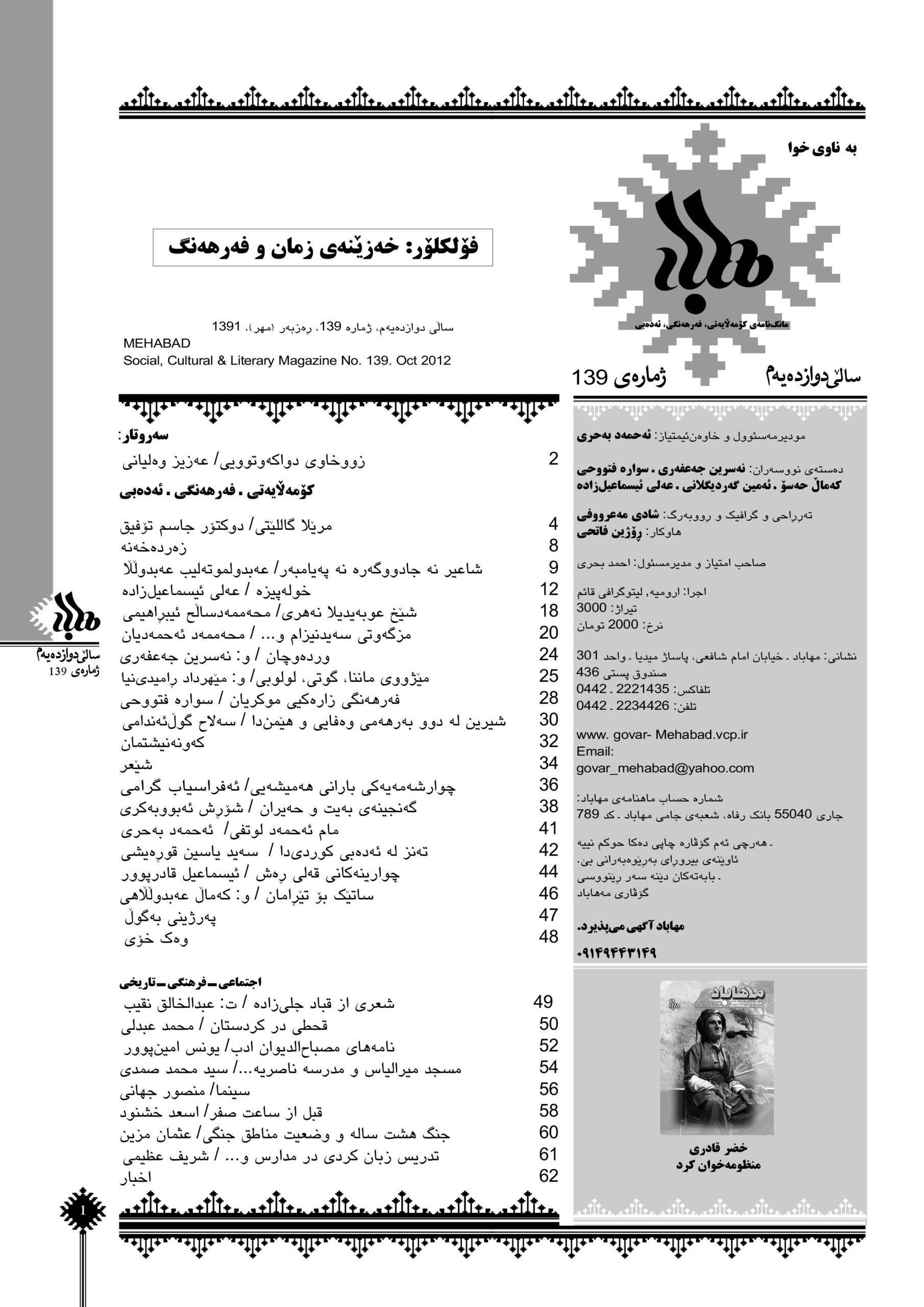 هاوڕێیانی ئازیزی گۆڤاری مەهاباد بۆ کڕینی ژومارەکانی گۆڤاری مەهاباد بە شێوازی فایلی پی دی ئێف تا کرانەویی دەرگای ئێلێکترۆنیکی کە پێویستیتان بە چ ژومارەیەک بوو تکایە پێوەندی بگرن بە تێلێفۆنەکانی بەشی پێوەندی ماڵپەڕەکەمان بە سپاسەوە هاوڕێ دەگەڵ رێزمان بۆ ئێوەی خۆشەویست.