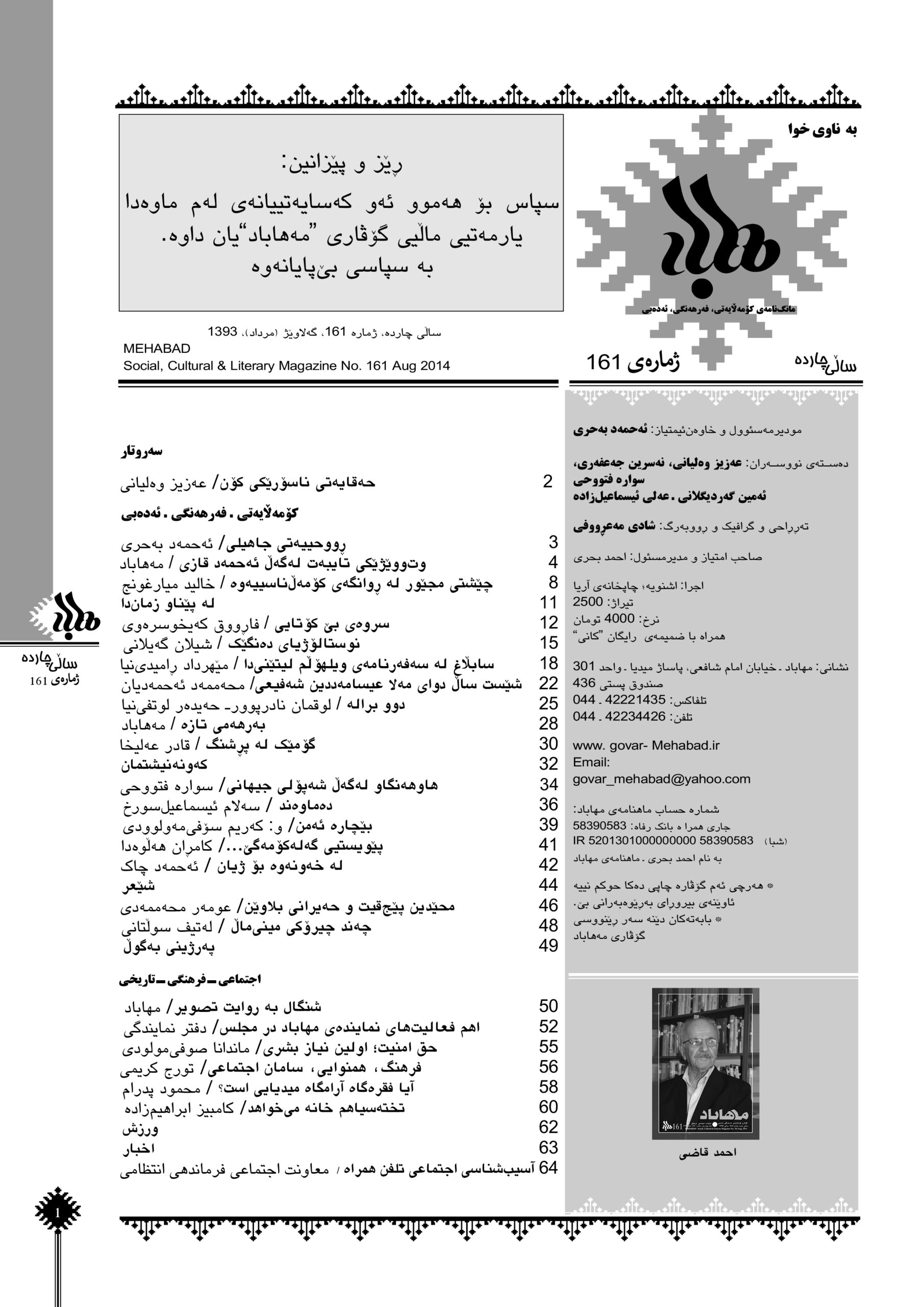 هاوڕێیانی ئازیزی گۆڤاری مەهاباد بۆ کڕینی ژومارەکانی گۆڤاری مەهاباد بە شێوازی فایلی پی دی ئێف تا کرانەویی دەرگای ئێلێکترۆنیکی کە پێویستیتان بە چ ژومارەیەک بوو تکایە پێوەندی بگرن بە تێلێفۆنەکانی بەشی پێوەندی ماڵپەڕەکەمان بە سپاسەوە هاوڕێ دەگەڵ رێزمان بۆ ئێوەی خۆشەویست.