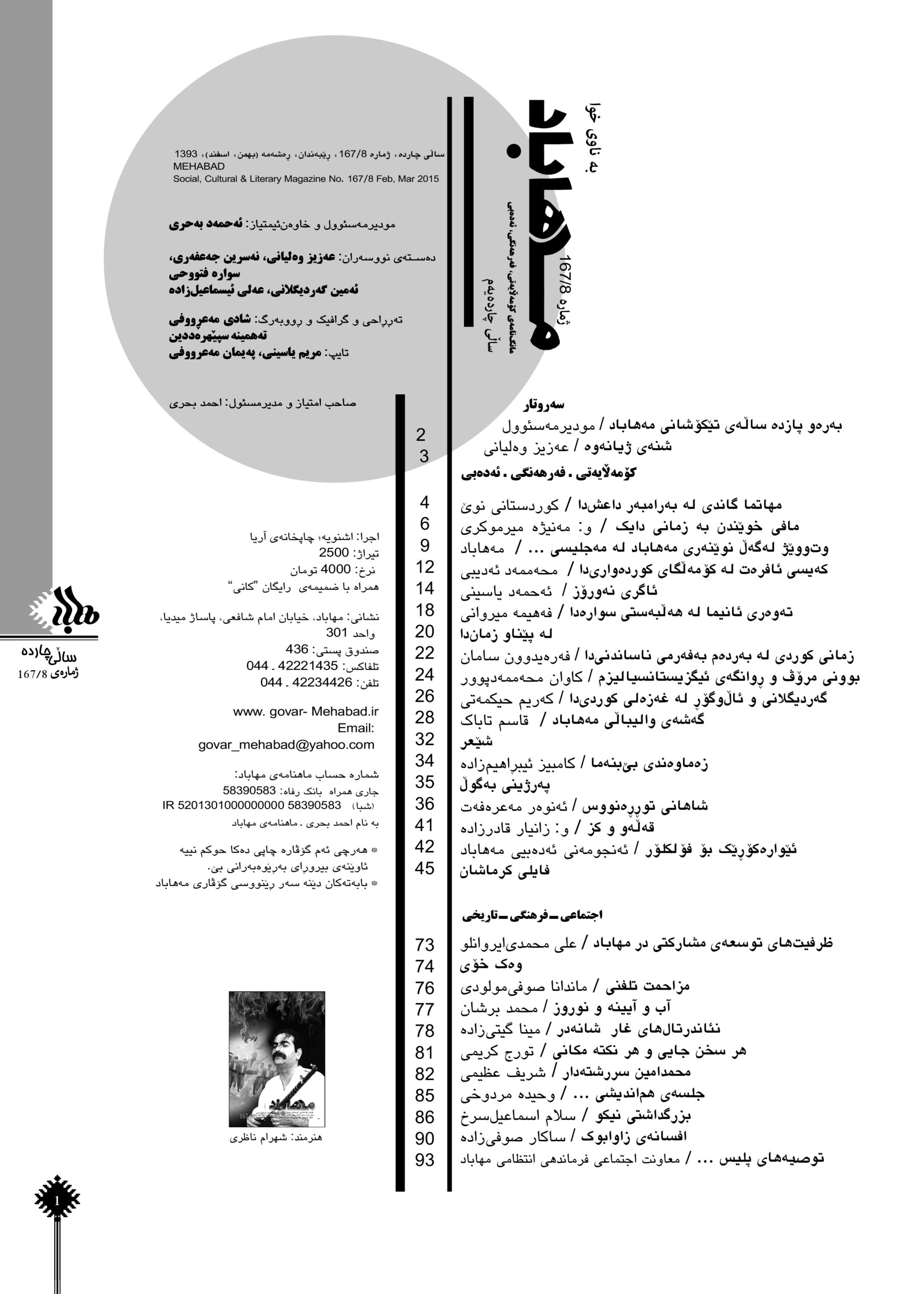 هاوڕێیانی ئازیزی گۆڤاری مەهاباد بۆ کڕینی ژومارەکانی گۆڤاری مەهاباد بە شێوازی فایلی پی دی ئێف تا کرانەویی دەرگای ئێلێکترۆنیکی کە پێویستیتان بە چ ژومارەیەک بوو تکایە پێوەندی بگرن بە تێلێفۆنەکانی بەشی پێوەندی ماڵپەڕەکەمان بە سپاسەوە هاوڕێ دەگەڵ رێزمان بۆ ئێوەی خۆشەویست.