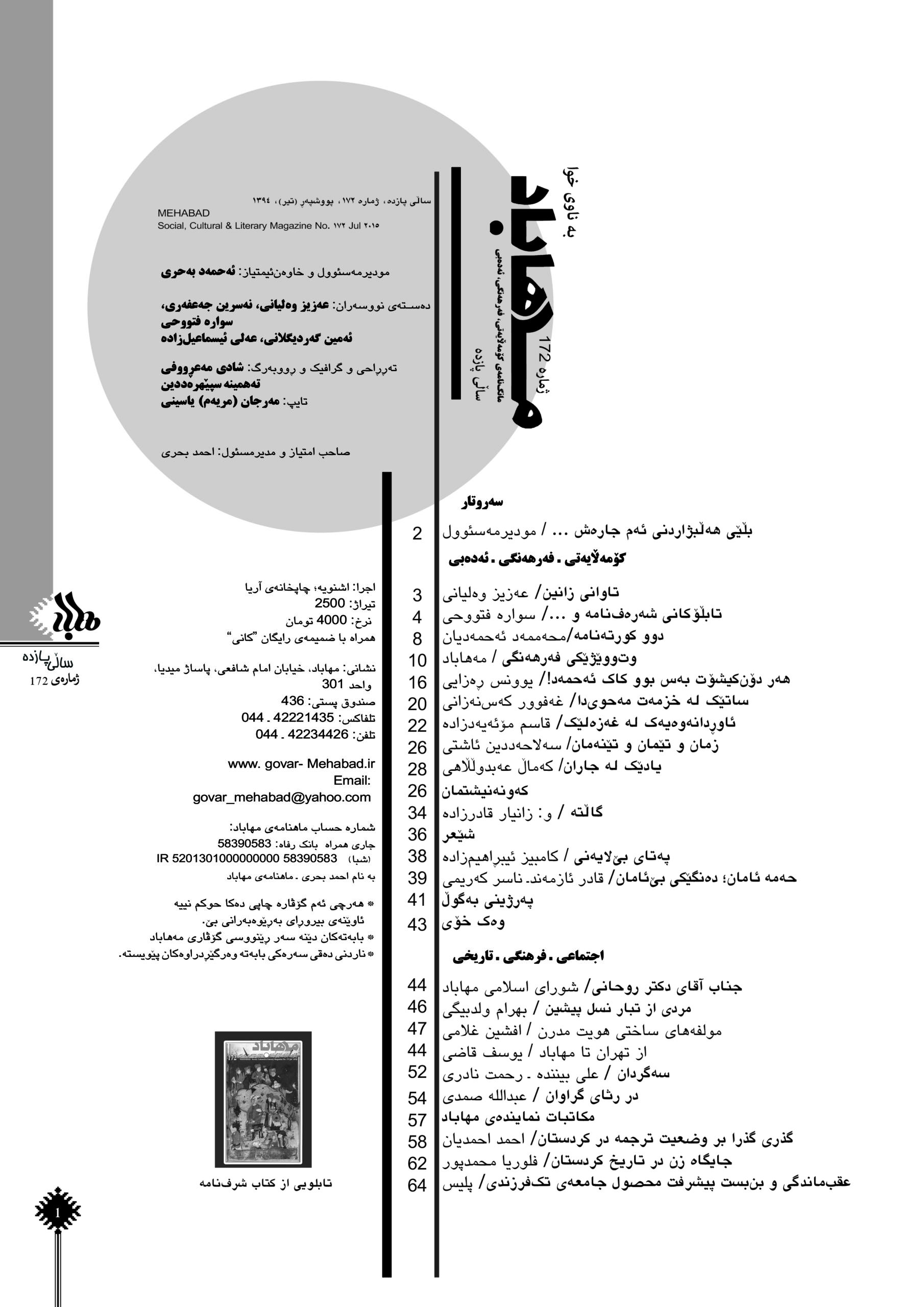 هاوڕێیانی ئازیزی گۆڤاری مەهاباد بۆ کڕینی ژومارەکانی گۆڤاری مەهاباد بە شێوازی فایلی پی دی ئێف تا کرانەویی دەرگای ئێلێکترۆنیکی کە پێویستیتان بە چ ژومارەیەک بوو تکایە پێوەندی بگرن بە تێلێفۆنەکانی بەشی پێوەندی ماڵپەڕەکەمان بە سپاسەوە هاوڕێ دەگەڵ رێزمان بۆ ئێوەی خۆشەویست.