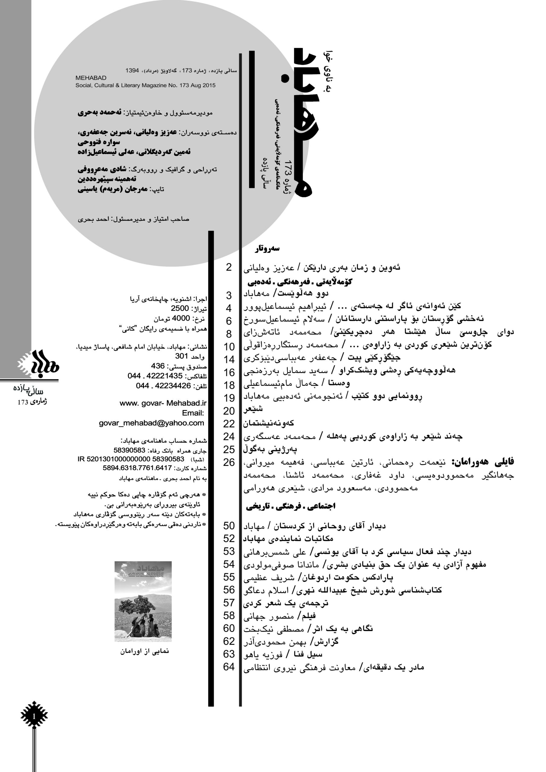 هاوڕێیانی ئازیزی گۆڤاری مەهاباد بۆ کڕینی ژومارەکانی گۆڤاری مەهاباد بە شێوازی فایلی پی دی ئێف تا کرانەویی دەرگای ئێلێکترۆنیکی کە پێویستیتان بە چ ژومارەیەک بوو تکایە پێوەندی بگرن بە تێلێفۆنەکانی بەشی پێوەندی ماڵپەڕەکەمان بە سپاسەوە هاوڕێ دەگەڵ رێزمان بۆ ئێوەی خۆشەویست.