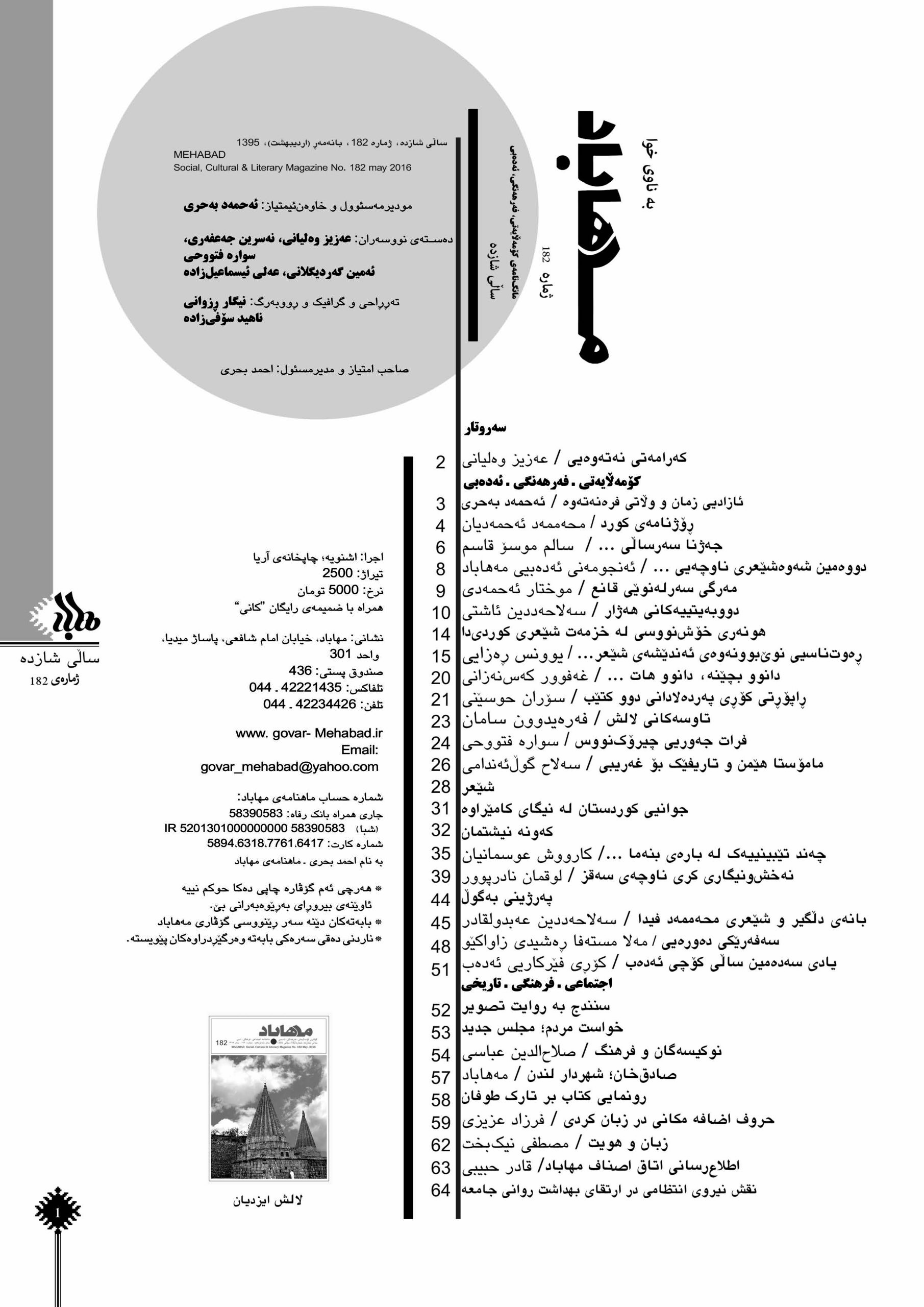 هاوڕێیانی ئازیزی گۆڤاری مەهاباد بۆ کڕینی ژومارەکانی گۆڤاری مەهاباد بە شێوازی فایلی پی دی ئێف تا کرانەویی دەرگای ئێلێکترۆنیکی کە پێویستیتان بە چ ژومارەیەک بوو تکایە پێوەندی بگرن بە تێلێفۆنەکانی بەشی پێوەندی ماڵپەڕەکەمان بە سپاسەوە هاوڕێ دەگەڵ رێزمان بۆ ئێوەی خۆشەویست.