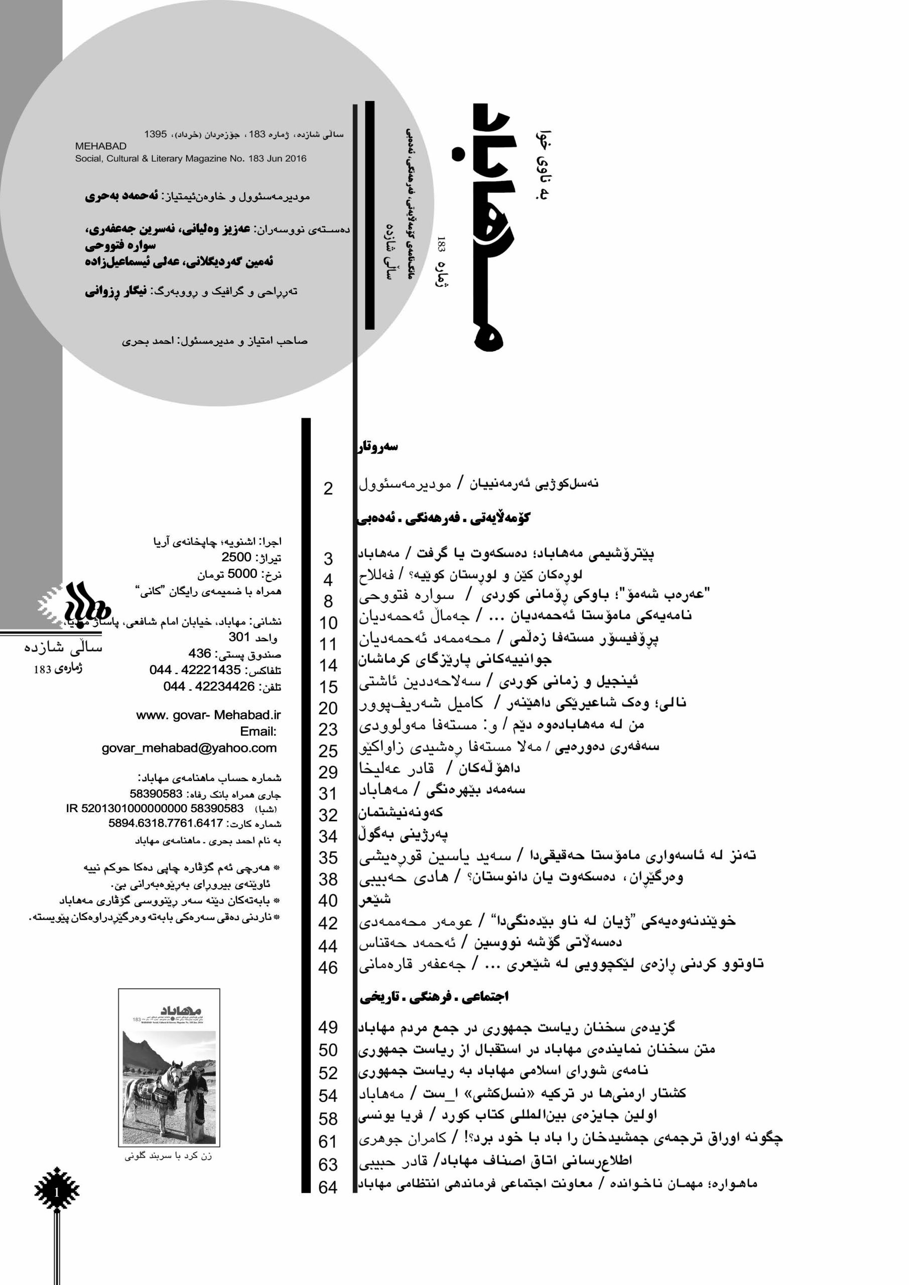 هاوڕێیانی ئازیزی گۆڤاری مەهاباد بۆ کڕینی ژومارەکانی گۆڤاری مەهاباد بە شێوازی فایلی پی دی ئێف تا کرانەویی دەرگای ئێلێکترۆنیکی کە پێویستیتان بە چ ژومارەیەک بوو تکایە پێوەندی بگرن بە تێلێفۆنەکانی بەشی پێوەندی ماڵپەڕەکەمان بە سپاسەوە هاوڕێ دەگەڵ رێزمان بۆ ئێوەی خۆشەویست.