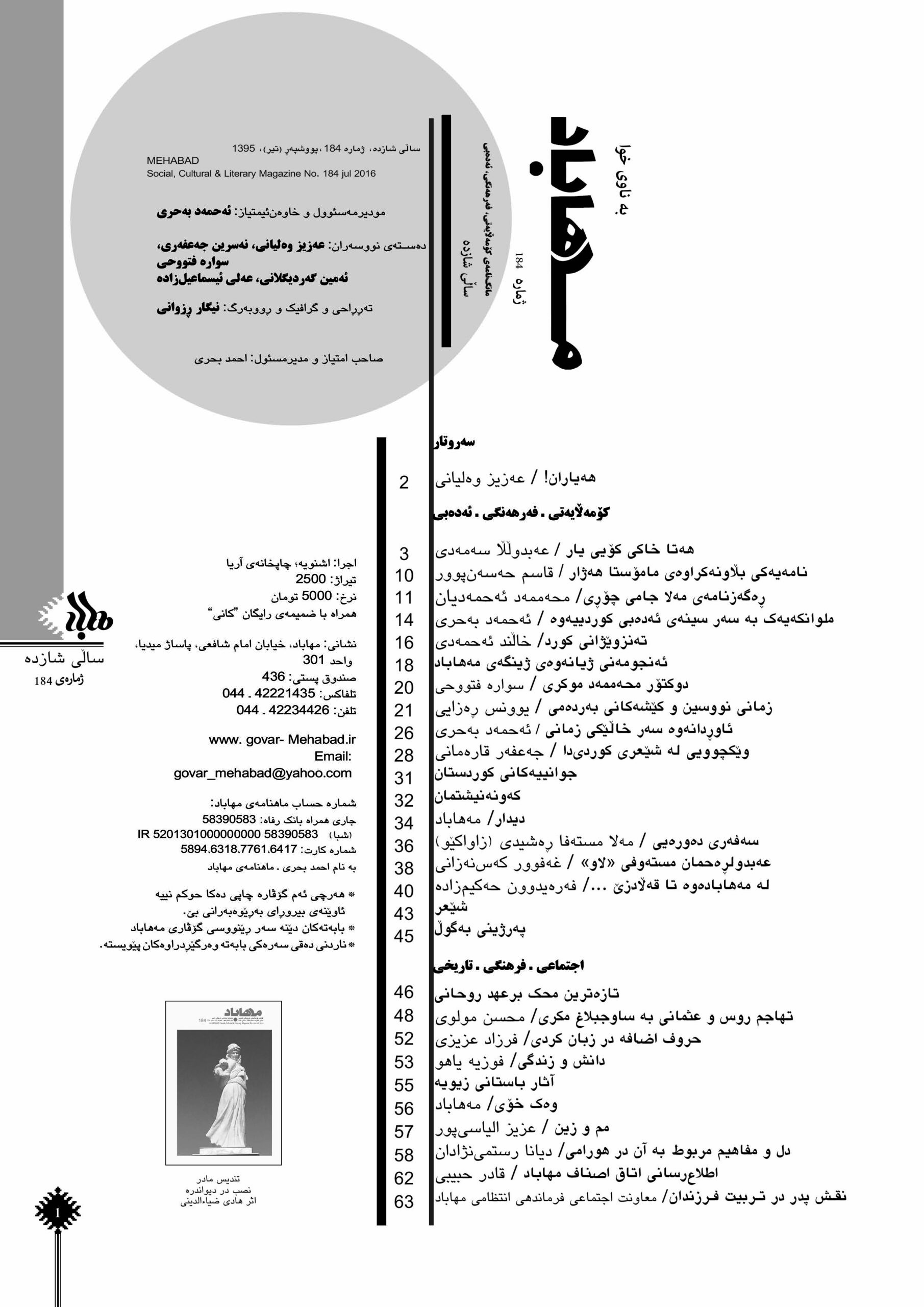 هاوڕێیانی ئازیزی گۆڤاری مەهاباد بۆ کڕینی ژومارەکانی گۆڤاری مەهاباد بە شێوازی فایلی پی دی ئێف تا کرانەویی دەرگای ئێلێکترۆنیکی کە پێویستیتان بە چ ژومارەیەک بوو تکایە پێوەندی بگرن بە تێلێفۆنەکانی بەشی پێوەندی ماڵپەڕەکەمان بە سپاسەوە هاوڕێ دەگەڵ رێزمان بۆ ئێوەی خۆشەویست.