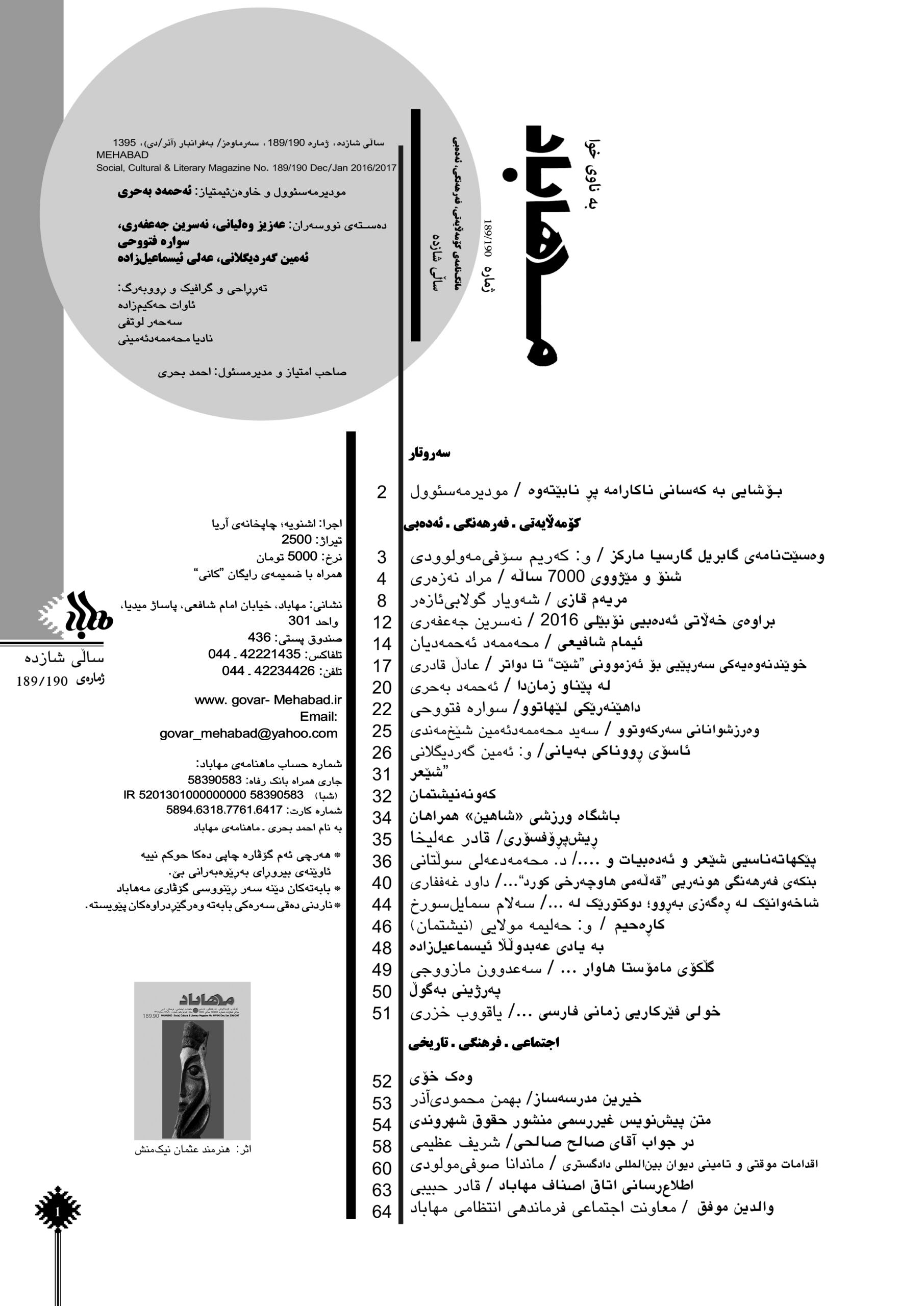 هاوڕێیانی ئازیزی گۆڤاری مەهاباد بۆ کڕینی ژومارەکانی گۆڤاری مەهاباد بە شێوازی فایلی پی دی ئێف تا کرانەویی دەرگای ئێلێکترۆنیکی کە پێویستیتان بە چ ژومارەیەک بوو تکایە پێوەندی بگرن بە تێلێفۆنەکانی بەشی پێوەندی ماڵپەڕەکەمان بە سپاسەوە هاوڕێ دەگەڵ رێزمان بۆ ئێوەی خۆشەویست.