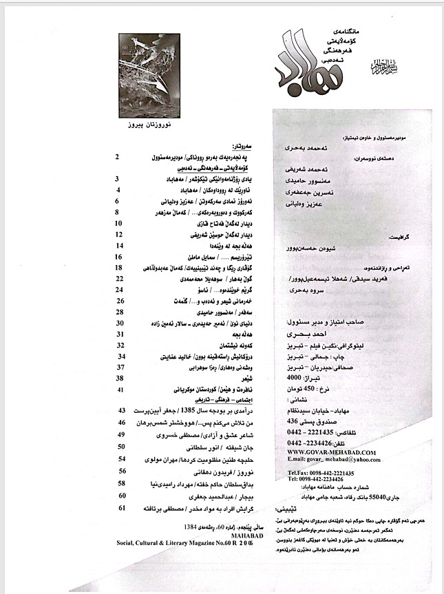 هاوڕێیانی ئازیزی گۆڤاری مەهاباد بۆ کڕینی ژومارەکانی گۆڤاری مەهاباد بە شێوازی فایلی پی دی ئێف تا کرانەویی دەرگای ئێلێکترۆنیکی کە پێویستیتان بە چ ژومارەیەک بوو تکایە پێوەندی بگرن بە تێلێفۆنەکانی بەشی پێوەندی ماڵپەڕەکەمان بە سپاسەوە هاوڕێ دەگەڵ رێزمان بۆ ئێوەی خۆشەویست.