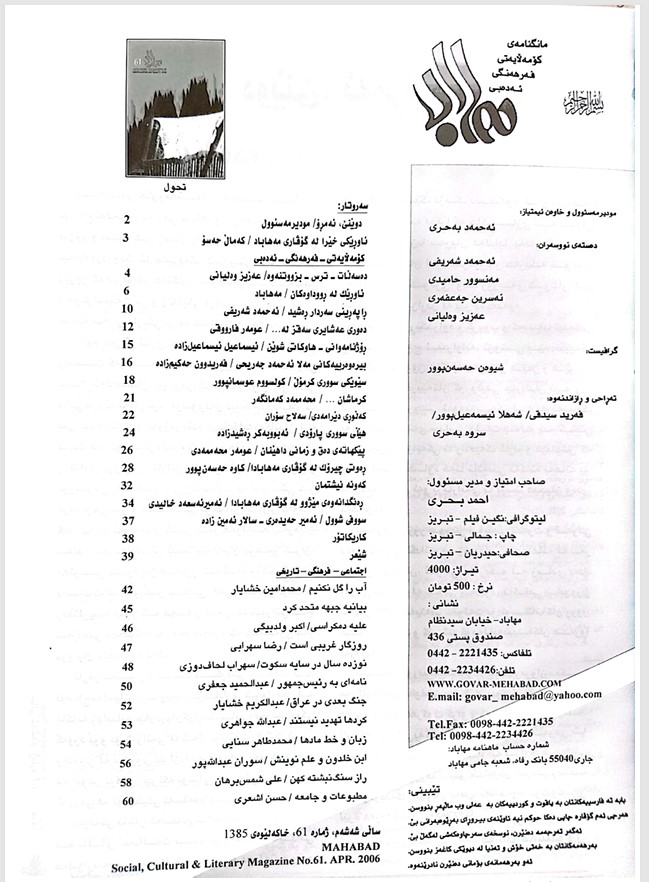 هاوڕێیانی ئازیزی گۆڤاری مەهاباد بۆ کڕینی ژومارەکانی گۆڤاری مەهاباد بە شێوازی فایلی پی دی ئێف تا کرانەویی دەرگای ئێلێکترۆنیکی کە پێویستیتان بە چ ژومارەیەک بوو تکایە پێوەندی بگرن بە تێلێفۆنەکانی بەشی پێوەندی ماڵپەڕەکەمان بە سپاسەوە هاوڕێ دەگەڵ رێزمان بۆ ئێوەی خۆشەویست.