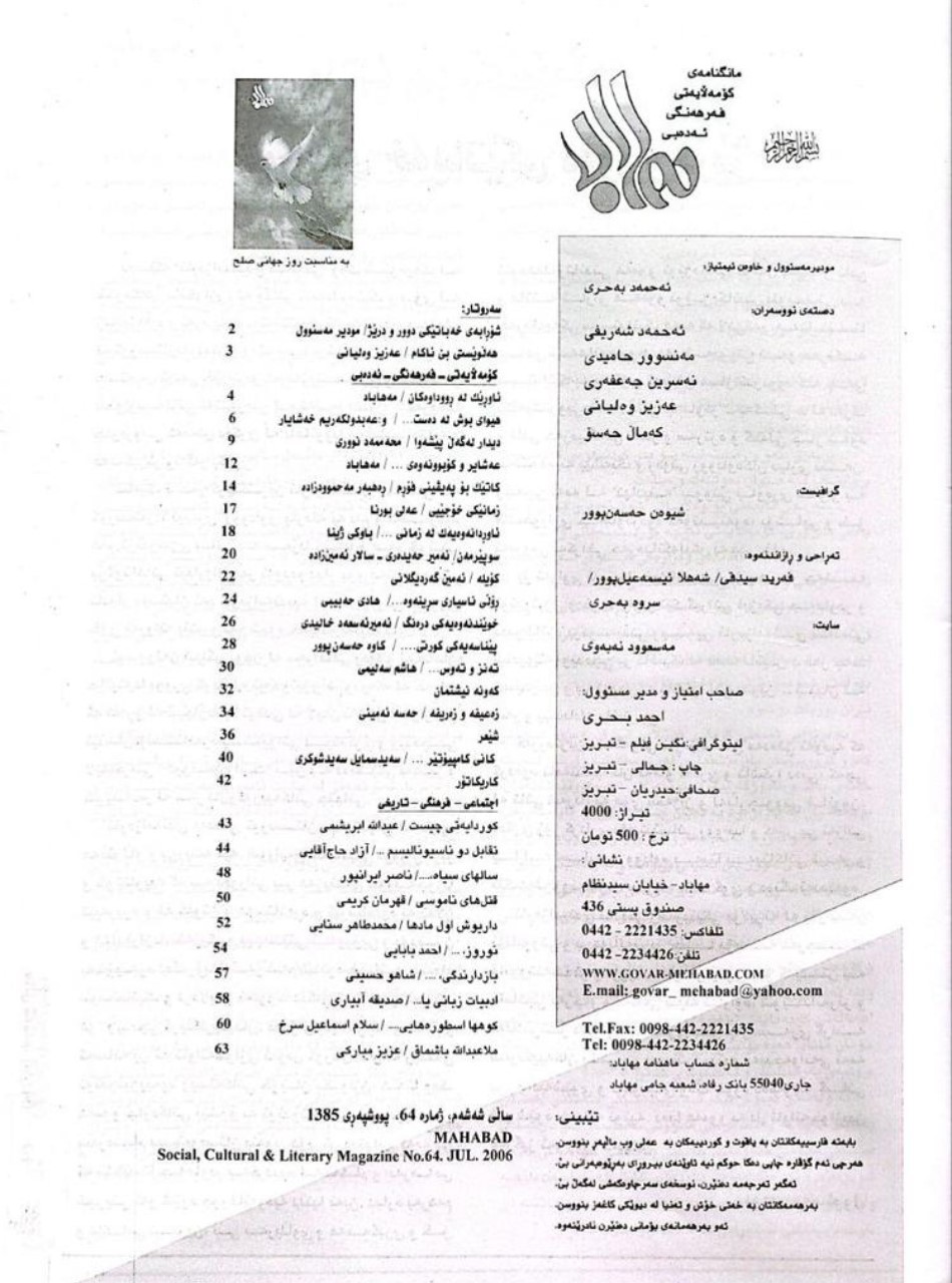 هاوڕێیانی ئازیزی گۆڤاری مەهاباد بۆ کڕینی ژومارەکانی گۆڤاری مەهاباد بە شێوازی فایلی پی دی ئێف تا کرانەویی دەرگای ئێلێکترۆنیکی کە پێویستیتان بە چ ژومارەیەک بوو تکایە پێوەندی بگرن بە تێلێفۆنەکانی بەشی پێوەندی ماڵپەڕەکەمان بە سپاسەوە هاوڕێ دەگەڵ رێزمان بۆ ئێوەی خۆشەویست.