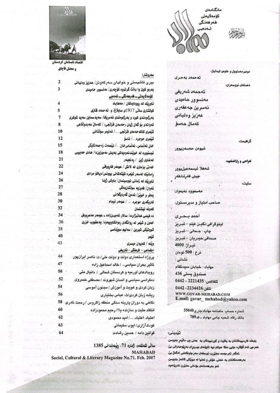 هاوڕێیانی ئازیزی گۆڤاری مەهاباد بۆ کڕینی ژومارەکانی گۆڤاری مەهاباد بە شێوازی فایلی پی دی ئێف تا کرانەویی دەرگای ئێلێکترۆنیکی کە پێویستیتان بە چ ژومارەیەک بوو تکایە پێوەندی بگرن بە تێلێفۆنەکانی بەشی پێوەندی ماڵپەڕەکەمان بە سپاسەوە هاوڕێ دەگەڵ رێزمان بۆ ئێوەی خۆشەویست.